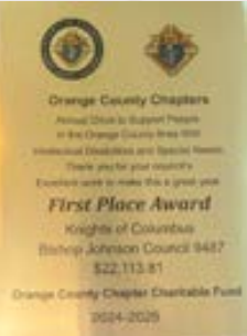 Our August activities: We kicked off the month with First Friday Adoration, and then on the 4th had a Scholarship Reception, where we gave out over $11,000 in scholarships to worthy children and grandchildren of Knights attending Catholic schools. August 10th we sponsored coffee and donuts for the parish. August 12th was Brother Jose Lopez’s last Red Cross Blood Drive as lead man, many thanks for his great stewardship as Director of the Blood Drive for all these years. On August 16th, PGK’s Tom Sixsmith and Mike Sofka attended a meeting at Chapter to receive the First Place plaque in the ID Drive for Council #9487! Also on the 16th, we had a “Campus Cleanup”, which achieved good results though only six brother Knights showed up. This is a great way to give back to the Church and enjoy fellowship with your brothers. I hope we can get at least triple this number at our next Campus Cleanup on October 18th.